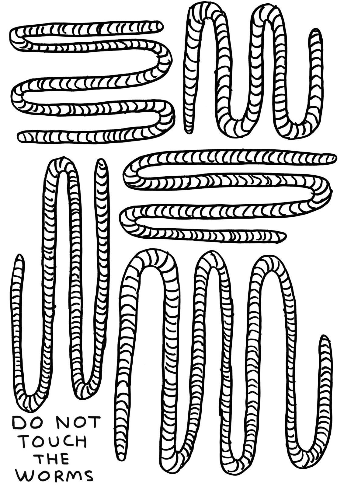 DO NOT TOUCH THE WORMS er den hidtil største udstilling af den britiske kunstner David Shrigley. På bedste Shrigley-manér blæses 20 lyserøde regnorme op til en abnorm størrelse og forvandler CCs største udstillingshal til en spillevende ormegård, hvor leddeløse væsner smyger sig om hinanden i et virvar.