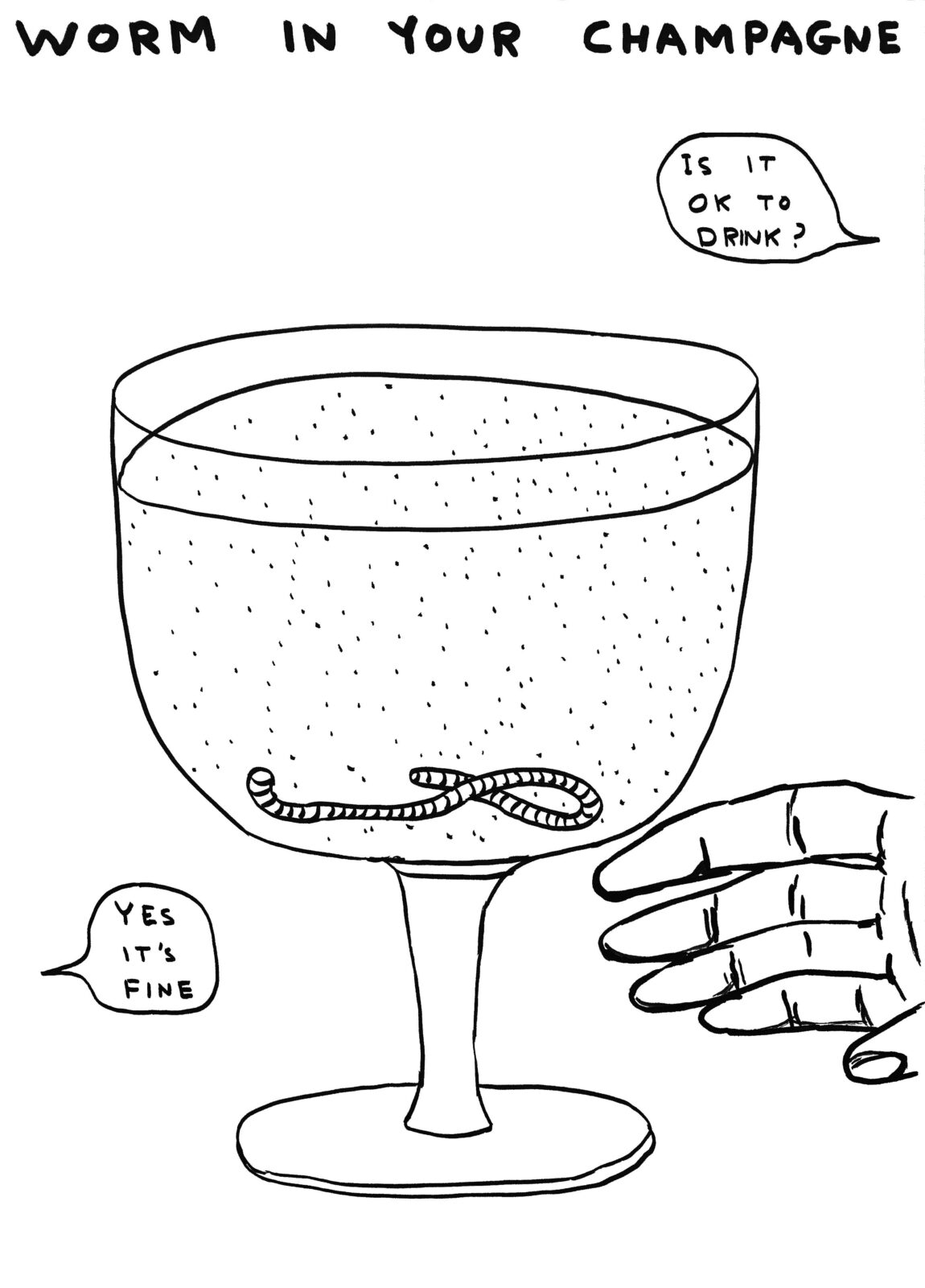 David Shrigley (f.1968) bor og arbejder i Brighton i England og er uddannet fra Glasgow School of Art i Skotland i 1991. Han er bedst kendt for sine humoristiske og ofte absurde tegninger. I sin kunstneriske praksis beskæftiger Shrigley sig med adskillige medier, herunder tegning, maleri, skulptur, installationer, fotografi, animationsfilm og linoleumstryk, der alle kredser om temaer som hverdagsliv og den menneskelige adfærd. Dertil udgiver han bøger, indgår i musikalske samarbejder og producerer selv musik.