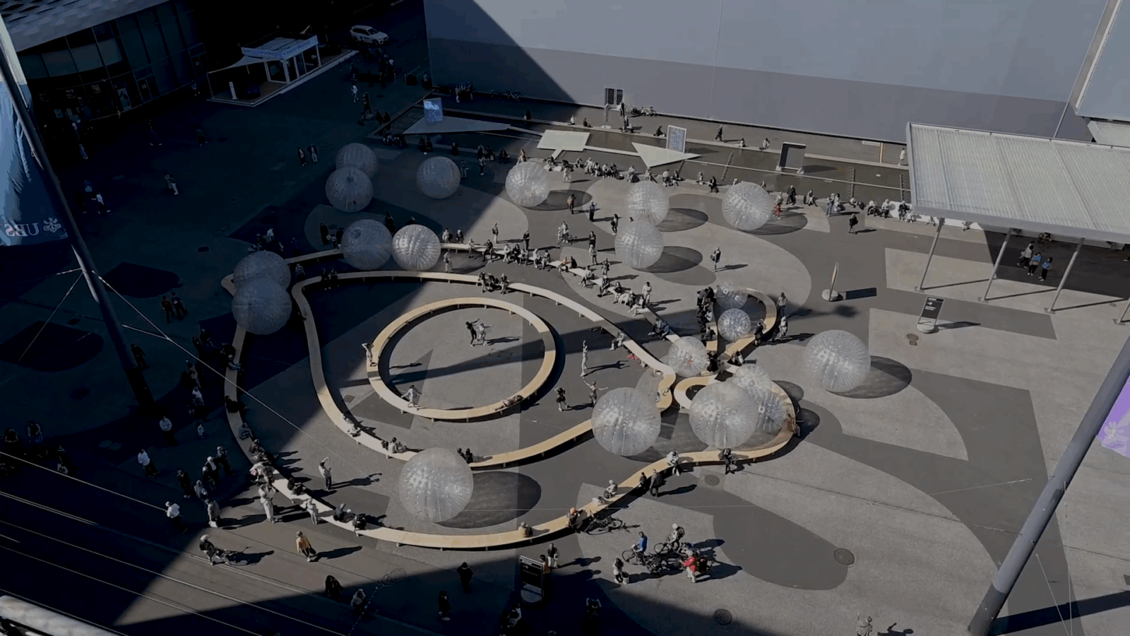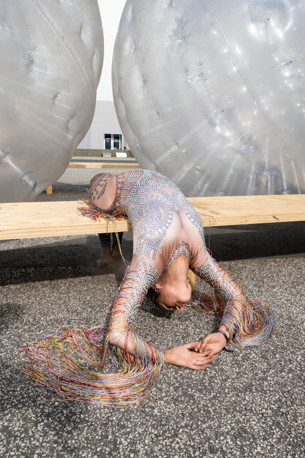 Tears is a large-scale installation and performance created by the artist Monster Chetwynd for Art Basel 2021. Chetwynd’s sculptural installation and performance Tears is inspired by Salvador Dalí’s jewel in the form of a crying eye and is a continuation of her artistic practice, which often involves performative works, various media, and the viewers themselves. In the spaces outside CC, Chetwynd will transform Dali’s precious object into a disrupted sculptural space, where so-called Zorbs will roll around. Performers inside these giant transparent balloons will initiate the movements, following the artist’s choreography to create a scene of teardrops dancing. Periodically, dancers in glamorous costumes will perform a scintillating sequence among the Zorbs. The project was conceived to create a moment of celebratory poetic absurdity in front of the entrance of the fair – a humorous but emphatic comment on the historical moment in which we are currently living.