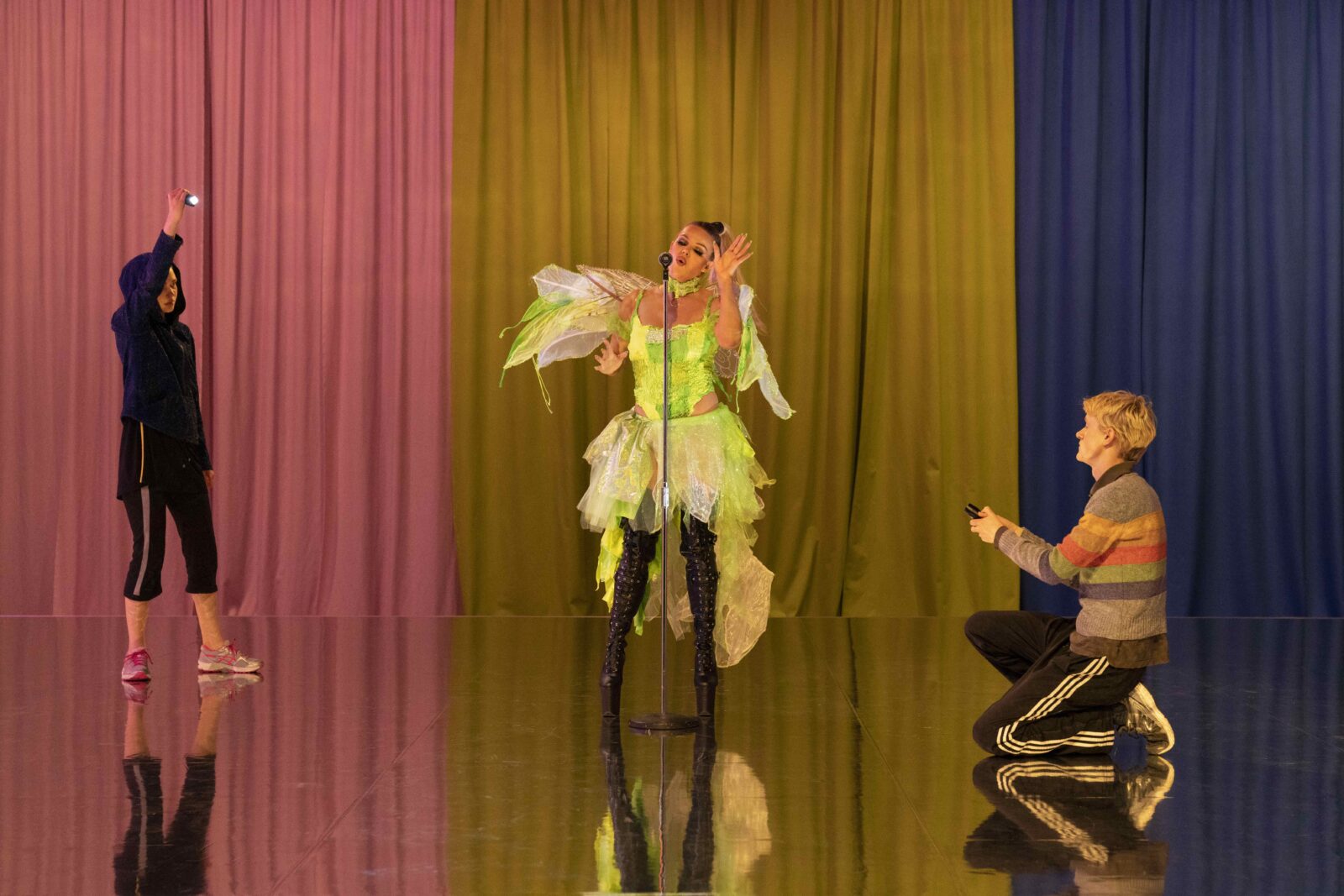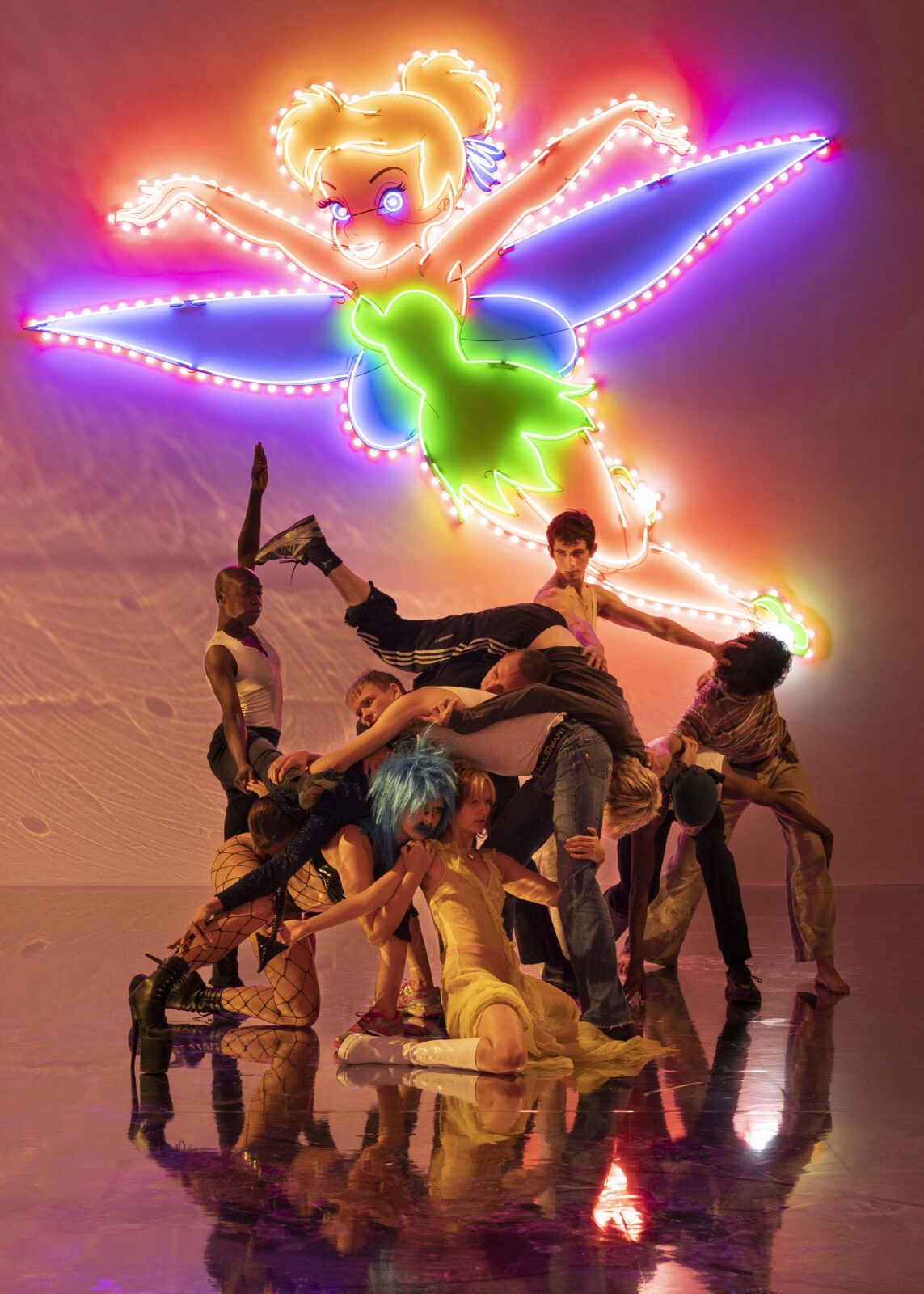 Out of rubble and old building materials from former Copenhagen Contemporary exhibitions rises a white-painted plateau with mirrored floors. A monumental neon sculpture of the classic Disney character Tinkerbell illuminates the scene. A pole is installed in the centre of the plateau and, along the walls, ballet bars. The back wall of the exhibition space is clad in textiles, forming a colourful backcloth, and the lighting in the space raises associations to rhythmic nightclub lighting. A screen floats in the semi-darkness, showing an earlier performance staged in the very same room.