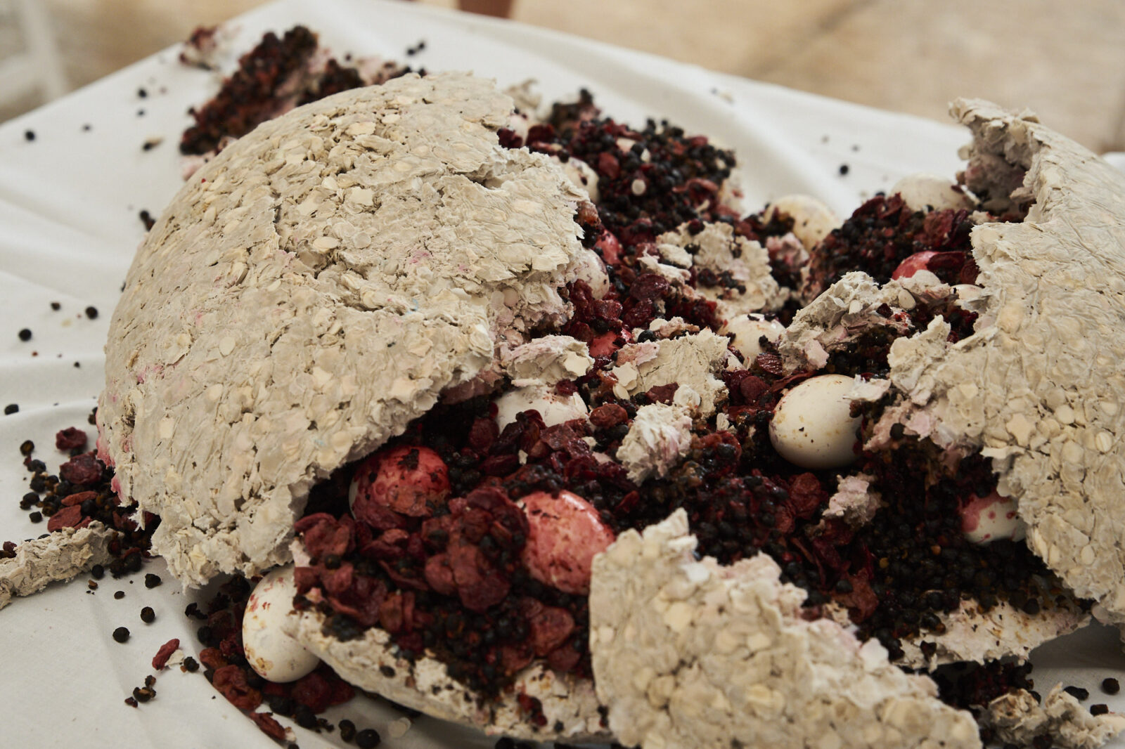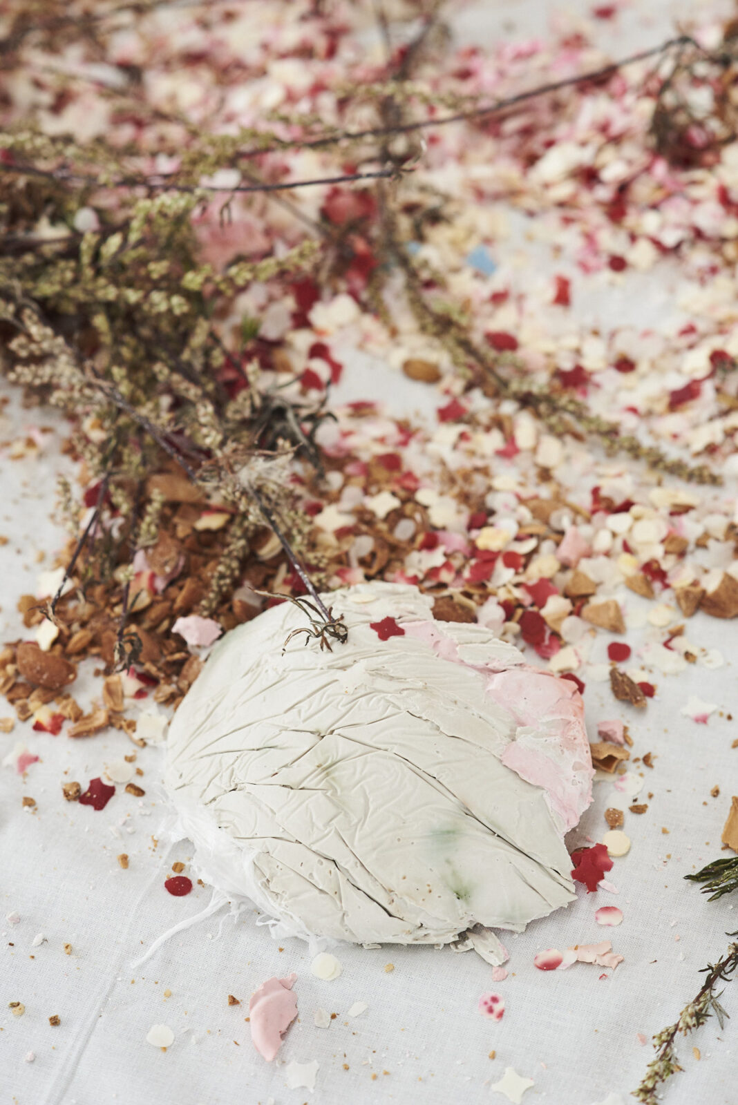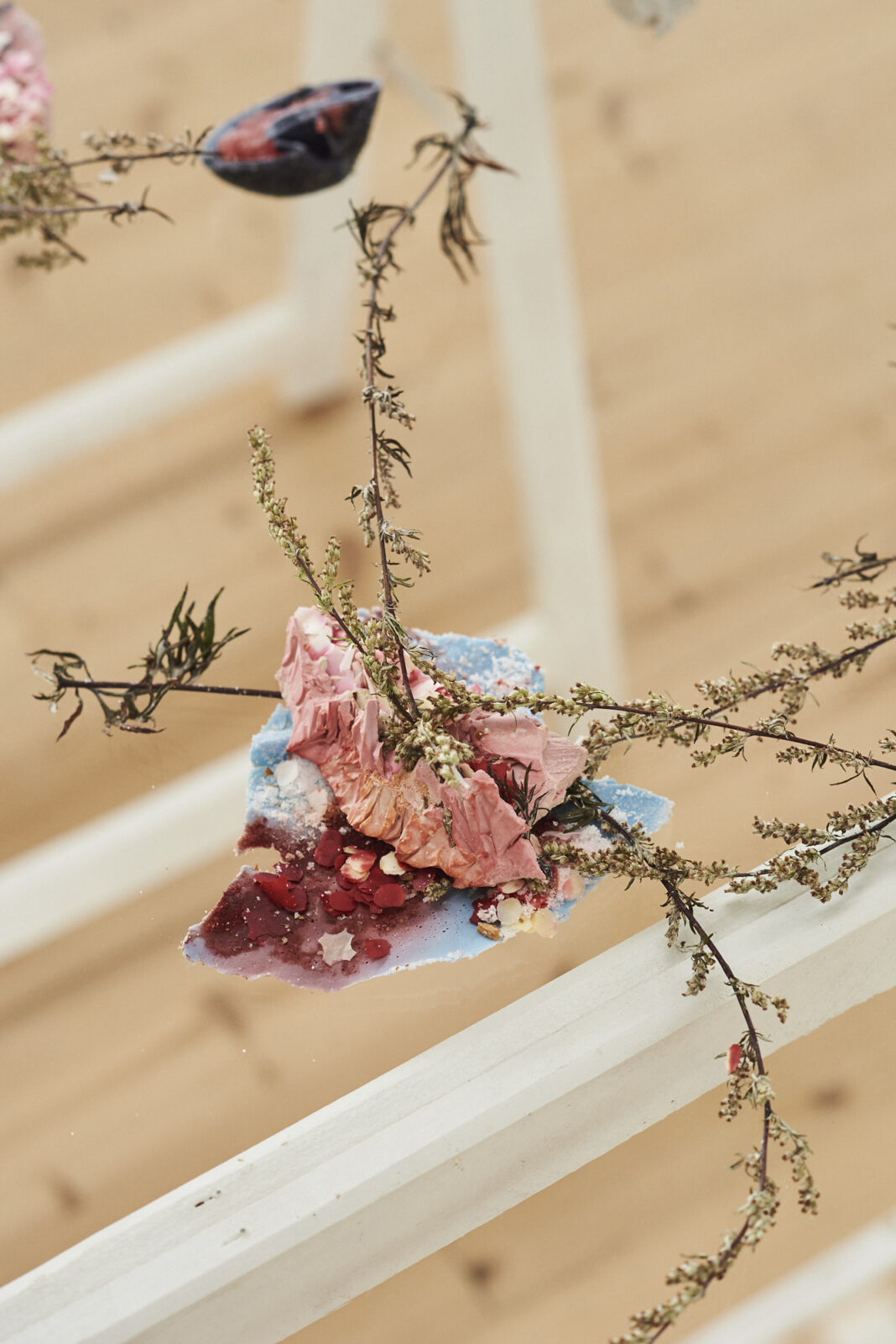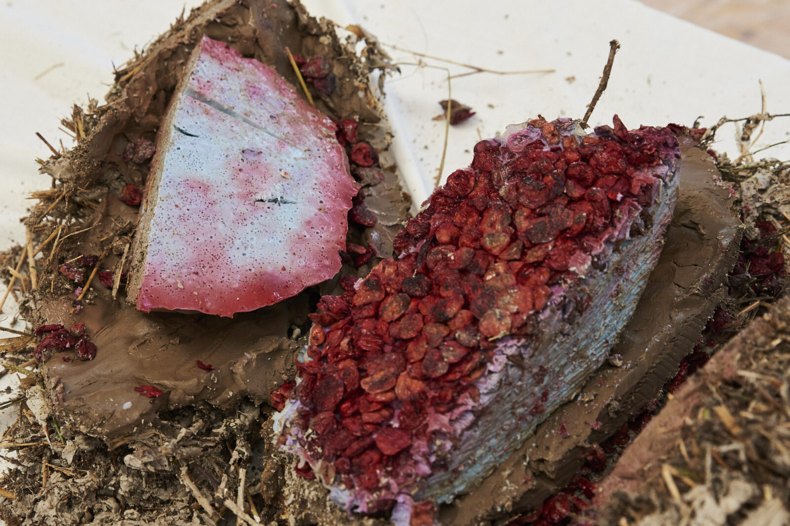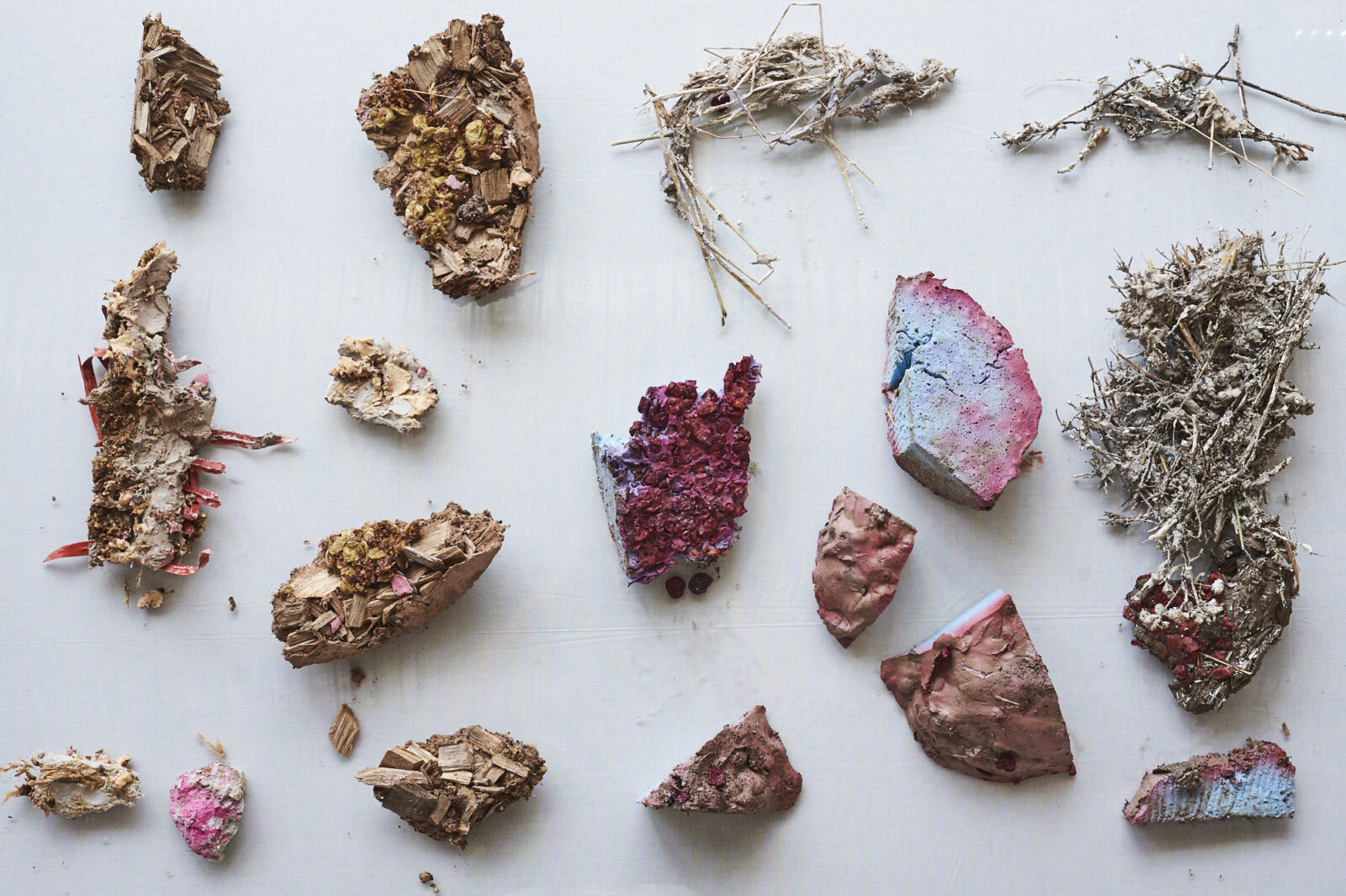 De forskellige materialers historier bliver på denne måde sammenflettet og smeltet til én sanselig masse for at blive smadret, spredt og undersøgt igen i nye konstellationer.