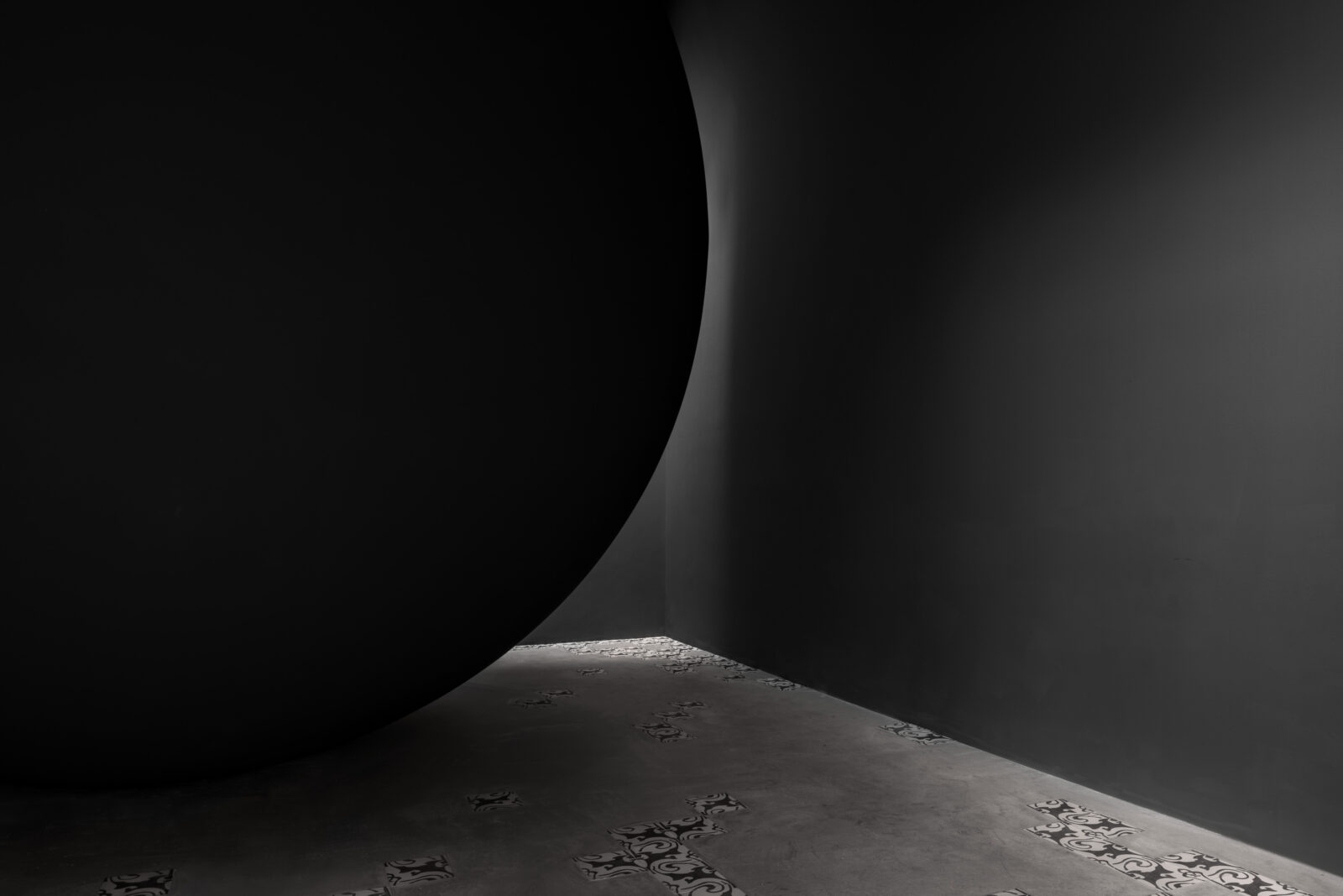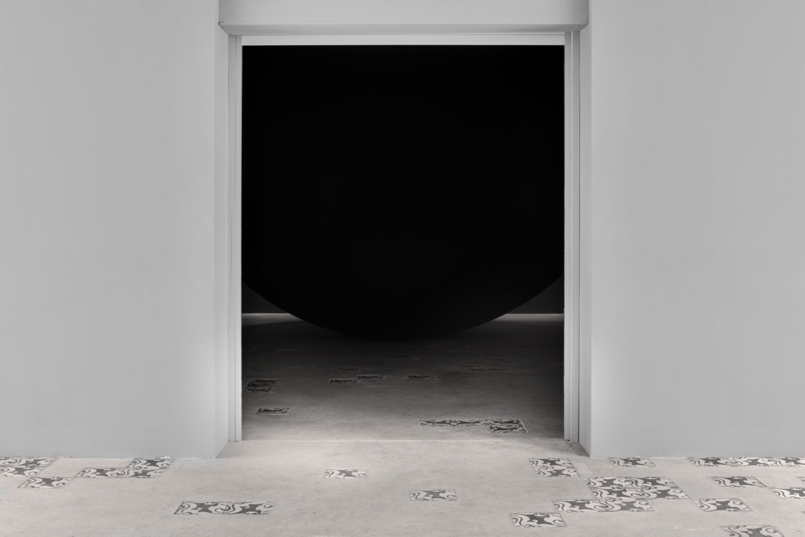 Alia’s stock of memories appears in the film as a large black sphere. It is part of her imaginary world and represents her broken memory, the absence of her own independent memories and identity. In the exhibition, the sphere materialised as the five-metre-tall jet black, spherical sculpture Monument for Lost Time. The floor around the sculpture was covered with beautifully decorated tiles, which also appear in the film work, rekindling memories from pre-apocalyptic times. The tiles are hand-painted by a tilemaker on the West Bank where Sansour has her roots.