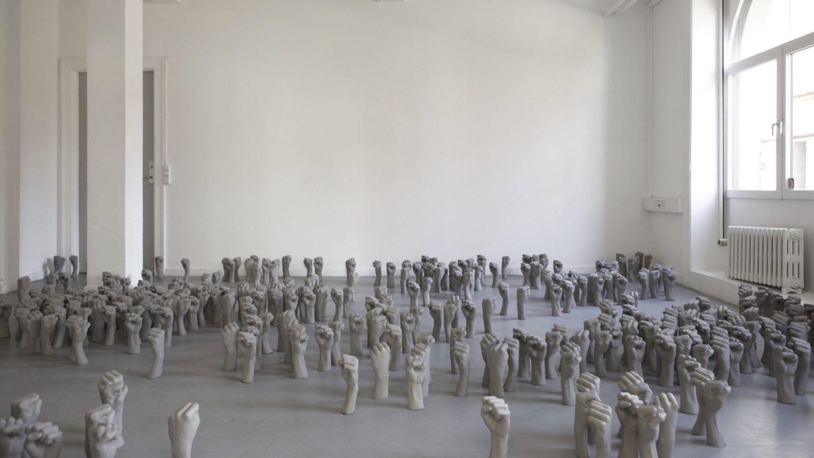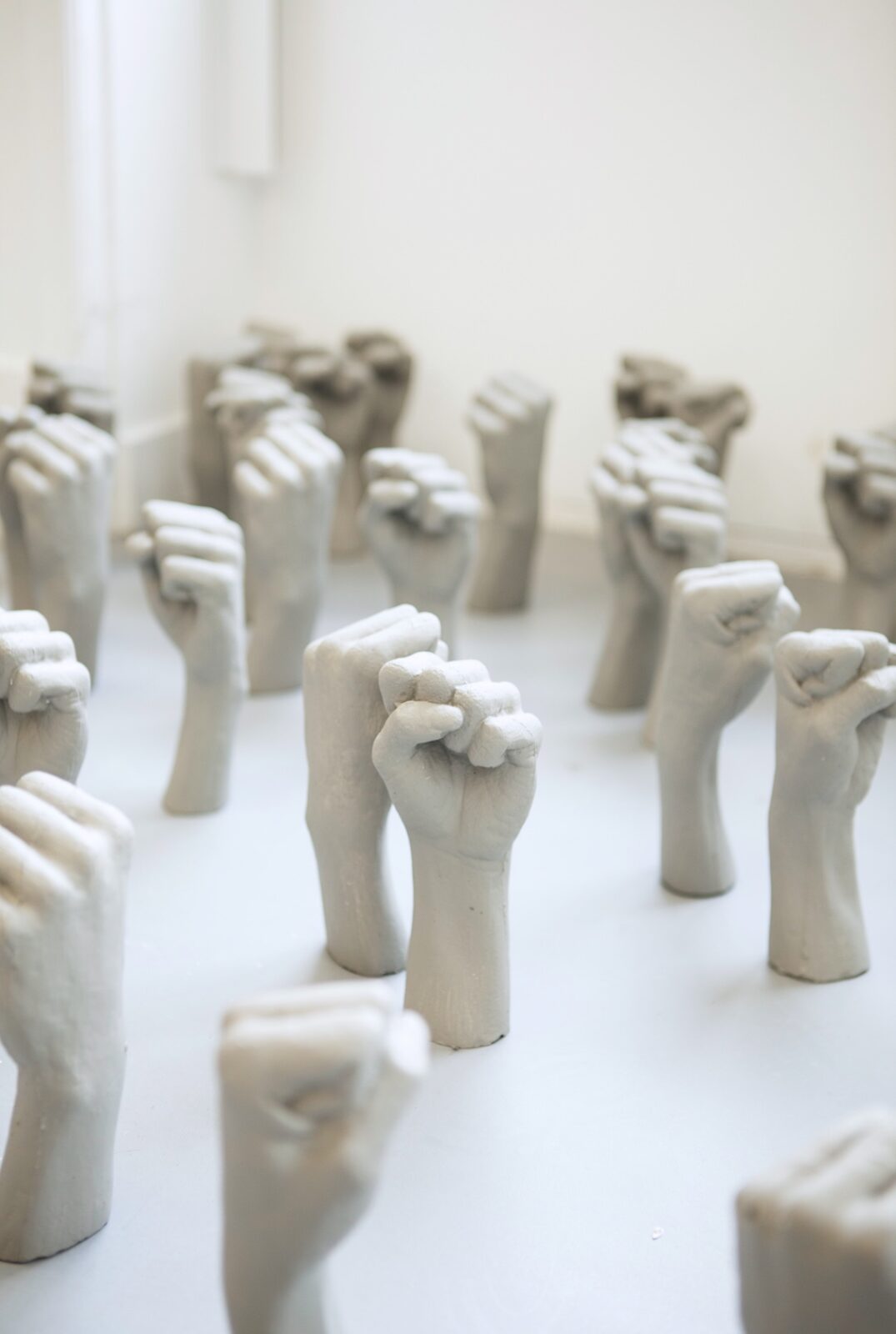 In August 2019 Louka Anargyros’ installation Power Bottom could be experienced in CC’s foyer. The installation took the form of a collection of unique hands, that were a cast of the artist’s own fist made out of painted plaster. It was as well possible to purchase the sculptures in support of the organisation Together We Push, working to improve conditions for refugee families living at the deportation center Sjælsmark Udrejsecenter. Each of the sculptures were sold for the amount of DKK 300 – or more if buyers wanted to donate a higher amount – and all money raised went exclusively to Together We Push.