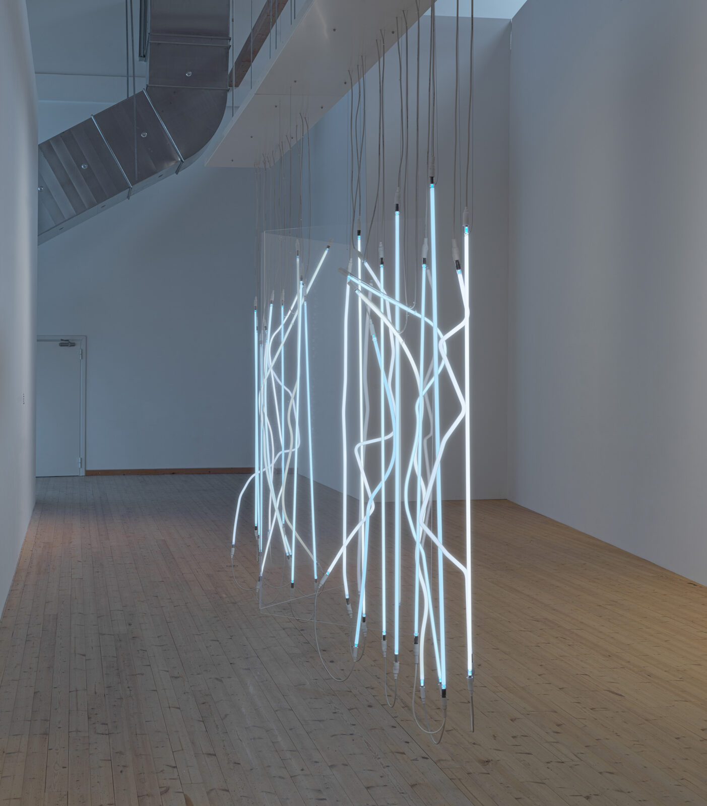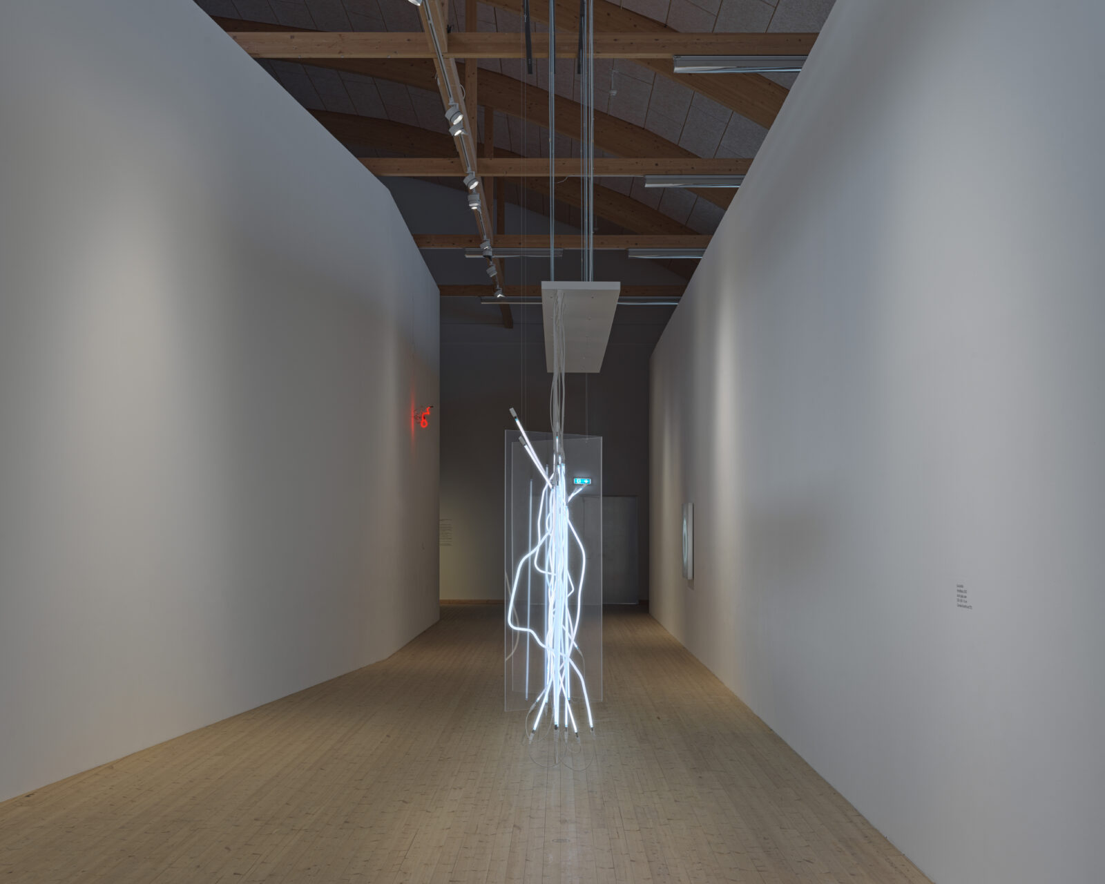 CC is displaying three works on loan from the artist’s collection, embodying her lifelong work with neon light. In the installation Porta Blanca (2000), neon light falls from above like scribbled lines on paper, while reflections from transparent plexiglass panels open the title’s white portal into another world beyond the physical exhibition space. Stratos (2010) hovers on the wall like an atmospheric vortex, its painted acrylic panel evoking a densely foggy, infinite space. Roxi (2023), a painterly neon tube weaving smoothly around hard steel, is impish and insistent like a punctuation mark in the line of exhibited works.