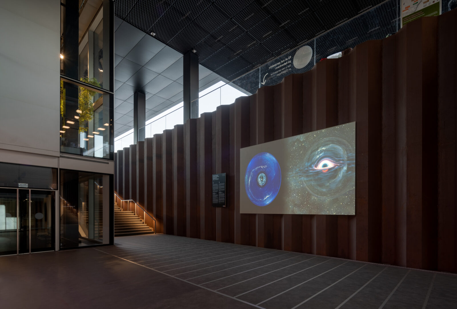 Nothing stands still. Even things we consider immutable are in constant motion – within, above and all around us. Motion is a fundamental premise of everything in the universe, from the tiniest atomic particles to the human body and the macrocosm of the stars. Recognized in glimpses, this greater, moving whole is embodied in spectacular artworks giving shape and form to complex phenomena like black holes, star formation and gravitational waves – from the macro scale of the expanding universe to the micro scale of atomic explosions and particle.