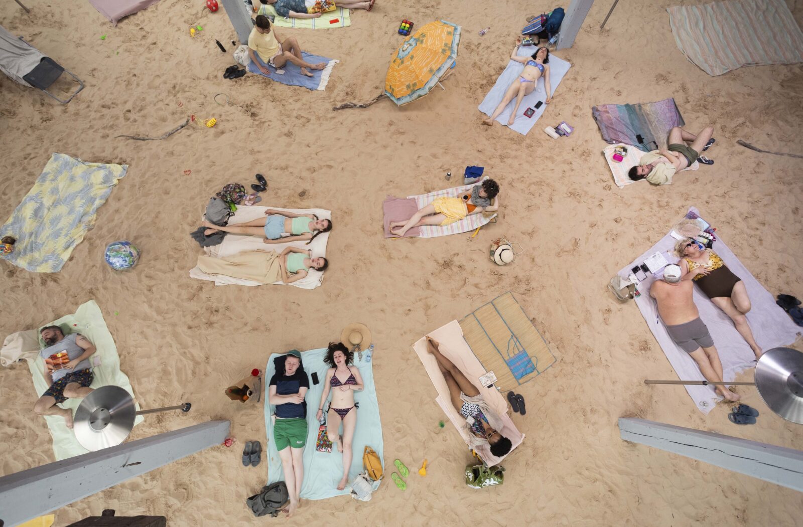 Fra et stillads over scenen kigger publikum ned på en sandstrand, komplet med solbadende gæster, en mosaik af håndklæder, farverigt badetøj og plastiklegetøj.